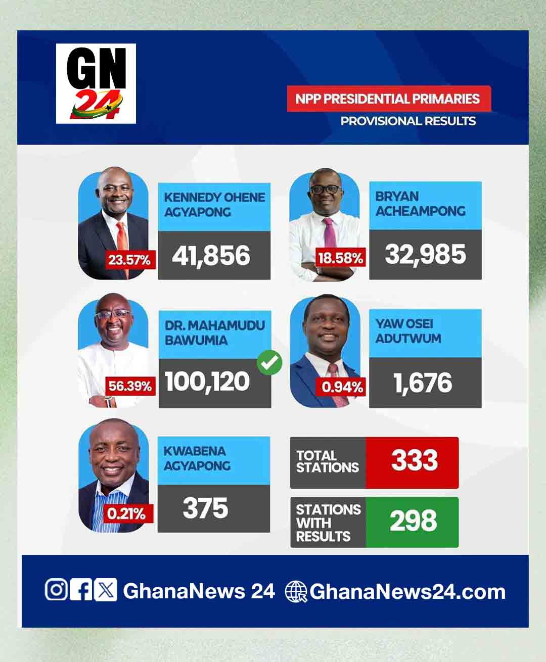 His closest rival, former Member of Parliament for Assin Central, Kennedy Agyapong, garnered 46,554 votes (23.76%), while former Minister of Food and Agriculture Dr Bryan Acheampong came third with 36,303 votes (18.53%). Former Minister of Education Dr Yaw Osei Adutwum received 1,999 votes (1.02%), and former NPP General Secretary Kwabena Agyapong secured 402 votes (0.21%).